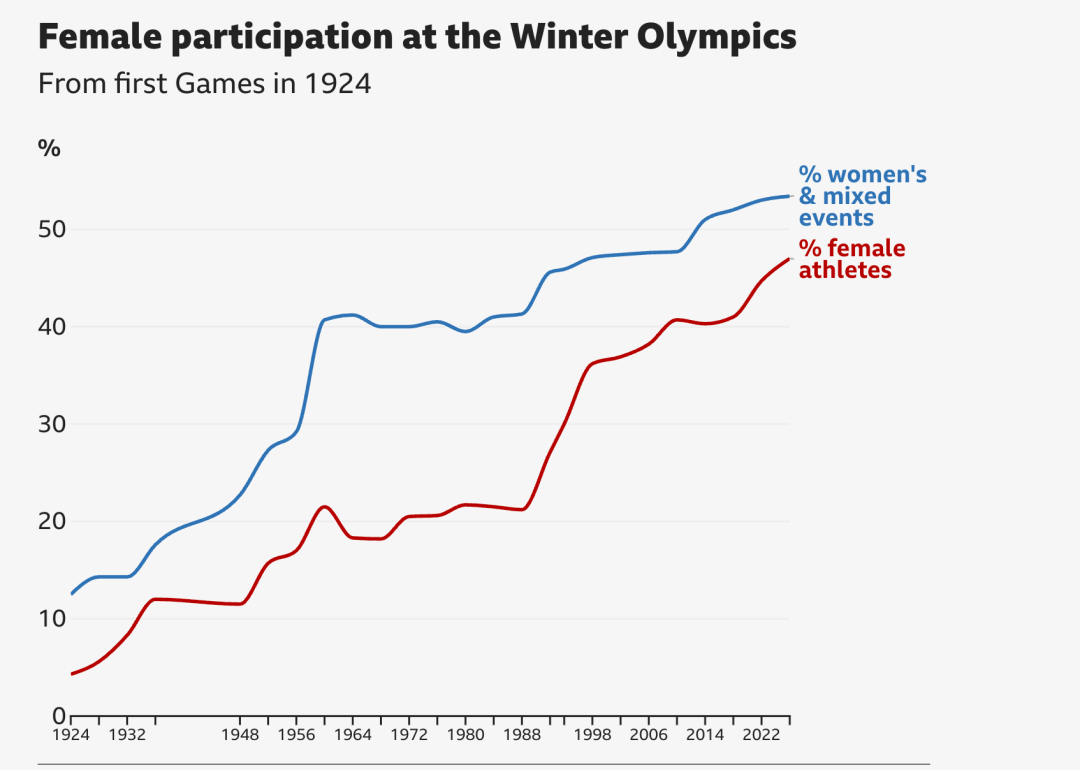 从1924年首届冬奥会到2026年米兰冬奥会,女性在冬奥舞台上的参与度实现了巨大跨越。一百多年前的首届赛事中,仅有11名女运动员登场,男选手数量约为她们的25倍。而根据国际奥委会信息,2026年冬奥会预计将有约1300名女运动员参赛,女性运动员可参与的项目占全部116个小项中的53.4%,创下冬奥历史新高。